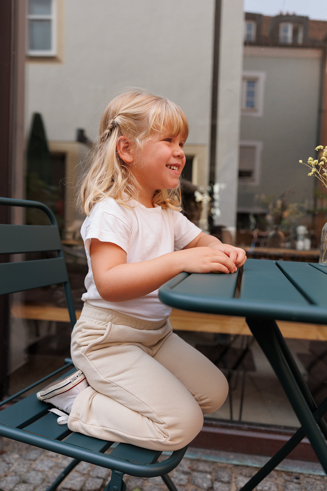 Vanessa (3 years / 2T) - wearing size 2T in cream pants and crew (picture 1 & 2)